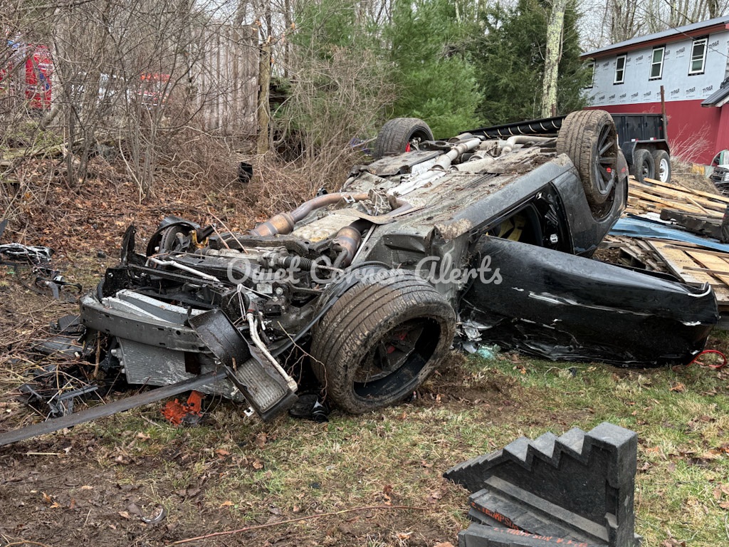 According to the Connecticut State Police, a 2021 Dodge Challenger SRT Hellcat, operated by a 56-year-old man residing on Bonnet Avenue in Thompson, was traveling southbound on Sand Dam Road. As the vehicle passed Babula Road, the operator failed to maintain his lane, left the roadway, and entered the yard of 230 Sand Dam Road, where it struck an unattached utility trailer. The vehicle then collided with a tree and overturned.